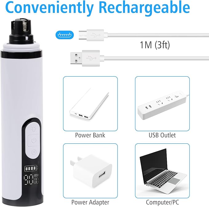 Pet Nail Grinder for Dogs and Cats - Super Quiet and Low Vibration Electric Dog Nail Grinder with 2 LED Lights - USB Rechargeable and Cordless - 3 Speeds - Small to Large Pets (White)