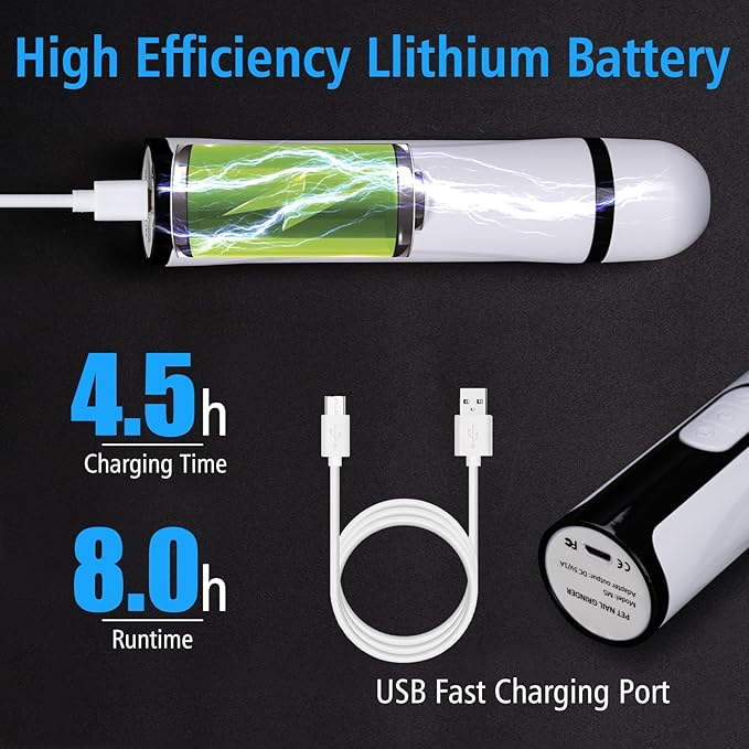 - 2000mAh Lithium Battery, LED Display: Equipped with a 2000mAh lithium battery, USB charging, it provides up to 8 hours of working time, which is 40% more running time than ordinary grinders. Unlike traditional nail grinders, our nail grinders are designed with a digital display, allowing you to easily monitor the speed level and battery life.
