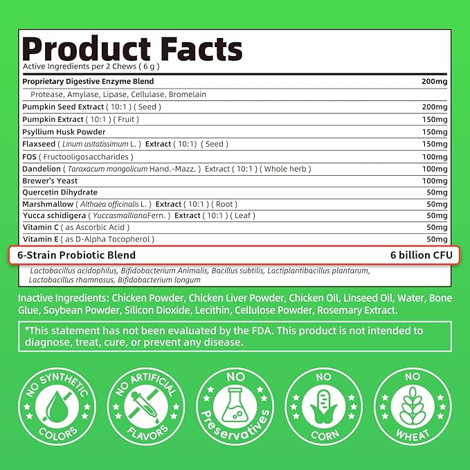 Premium Dog Digestive Enzymes and Probiotics with Pumpkin for Gut Health Support - Daily Chews for Digestion & Gas Relief - Chicken Flavor-90 Count