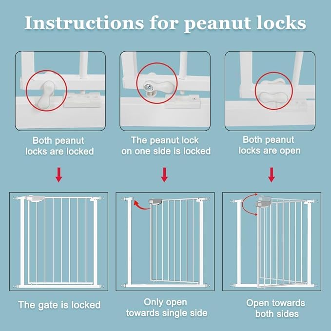- 【Triple Lock System】Babies will be blocked by the safety baby gate since we designed a triple locking system that is easy for adults to open while tough for babies. At the top of the gate, there are two buttons and each of them controls one lock. To open the gate, you should press both buttons simultaneously. And at the bottom of the gate, there are two peanut locks to control the opening direction and locking. With these triple locks, curious babies will be well protected by our metal gate