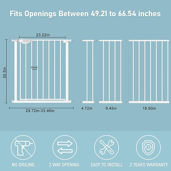 - 【Multi Use】The width of the triple lock extra wide pressure mounted baby gate can be adjusted from 29.72 inches to 90.94 inches so that it is available for stairs, doorways, and other diverse occasions to stop babies or pets to climb over. Tips: before installation, there will be a gap between the wide gate latch and the frame which is NOT a defect and it is NOT bent. This gap will disappear once installed
