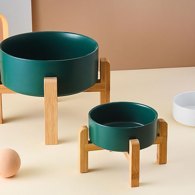 - NON SLIP WOOD STAND -You can get two different heights by flipping the bamboo stand,the elevated medium size ceramic pet bowls are perfect for small and medium dogs from different stages of childhood to adulthood, The wood stand on the bowls stopping ceramic dog bowl from sliding around, Keeps pet food and water in the bowls.