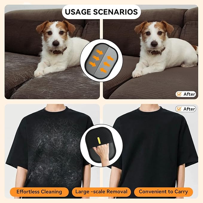 - 【IElectrostatic Pet Hair Remover Glove】Featuring an elastic wrist strap and breathable mesh fabric, this glove stays securely in place and it’s highly effective at removing pet hair from clothes, furniture, car seats, and more
