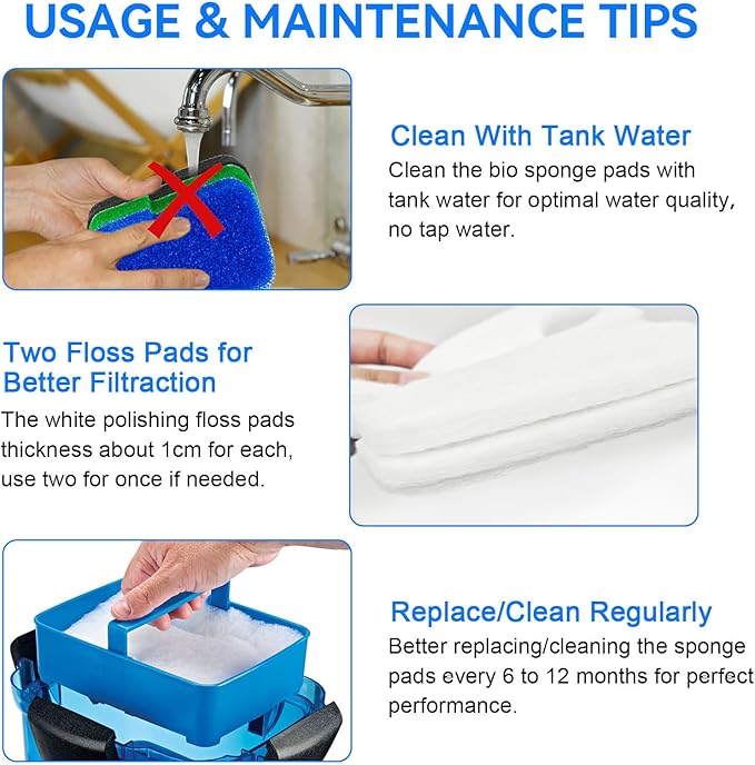 - Tips for Maintenance:✔Replace or rinse sponge pads every 6 to 12 months for optimal performance✔Better replace the white polishing pad every 2 to 6 weeks.✔Resine the bio sponge pads with tank water for optimal water quality, do not use tap water.
