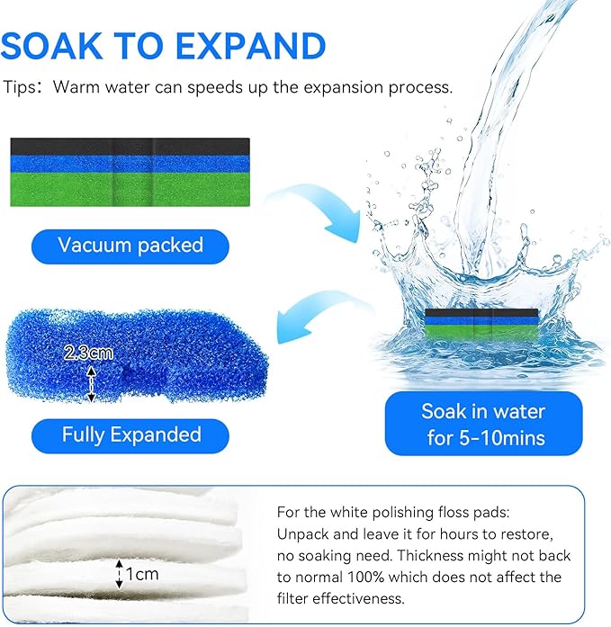 - Soak to Expand - The canister filter media pads are vacuum-sealed for easy shipping, so they may appear thinner upon unpacking. Simply soak them in water for 5–10 minutes, and they will return to their original size without affecting performance.Warm water can speeds up the expansion process.