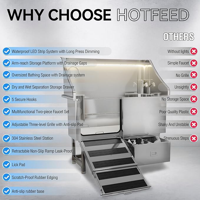 - Safety & Durability for Stress-Free Grooming - The 304 stainless steel dog bathtub resists corrosion and chewing, while scratch-proof rubber edging protects pets and owners from sharp edges. Combined with an anti-slip rubber base, dog bathtub ensures a secure, injury-free environment for all breeds