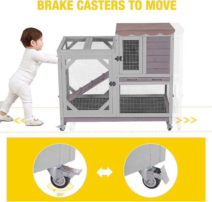 AIVITUVIN 2-Story Rabbit Hutch Indoor for 2-4 Rabbits & Guinea Pigs Wooden Small Animal Cage Guinea with Chew-Proof Design & Slide-Out Trays Bunny Cage with Lockable Wheels