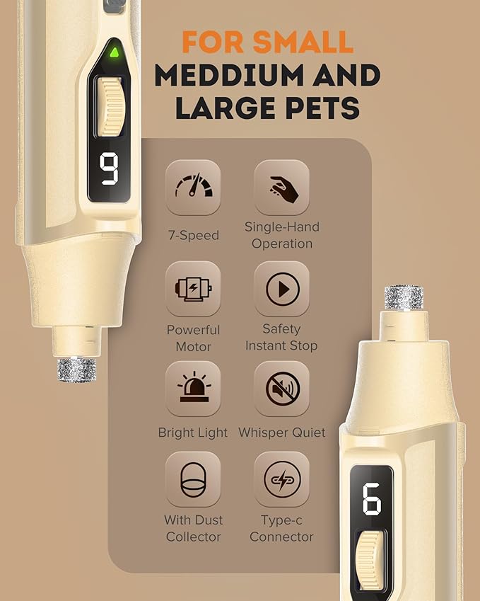 • 7 SPEEDS ADJUSTABLE: Ranging from 8,000 to 15,000 RPM, as one of the most powerful grinders, ideal for trimming the nails of small, medium, and large dogs, cats, birds, and other small animals