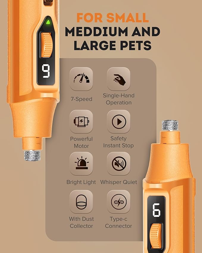 - INCLUDES DUST COLLECTOR: No more mess! The dog nail grinder features a built-in dust collector to keep nail filings contained, providing a tidy grooming session for both you and your pet