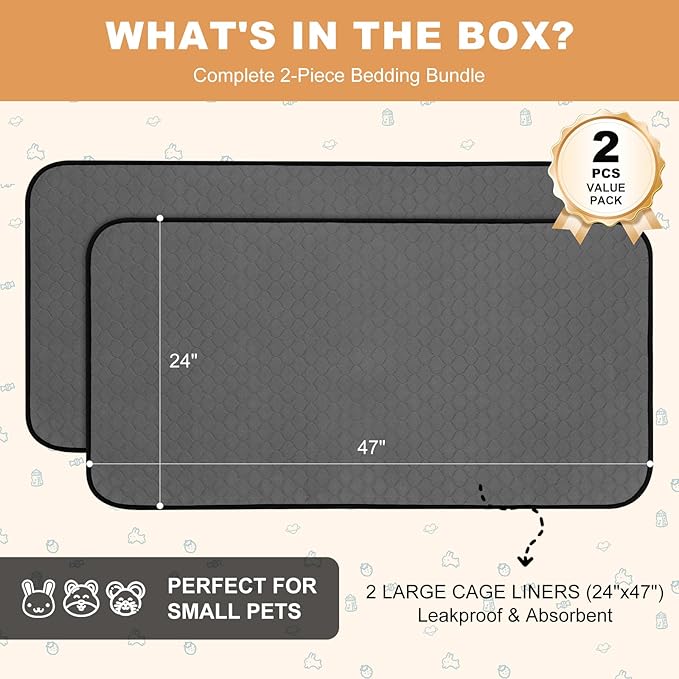 Washable Guinea Pig Liners for Cage, 2 Pack 24" X 47" Super Absorbent Reusable Guinea Pig Bedding Pee Pads Tarp Bottom for C&C Cage with Rabbits, Bunny, Chinchesillas, and Other Small Animals