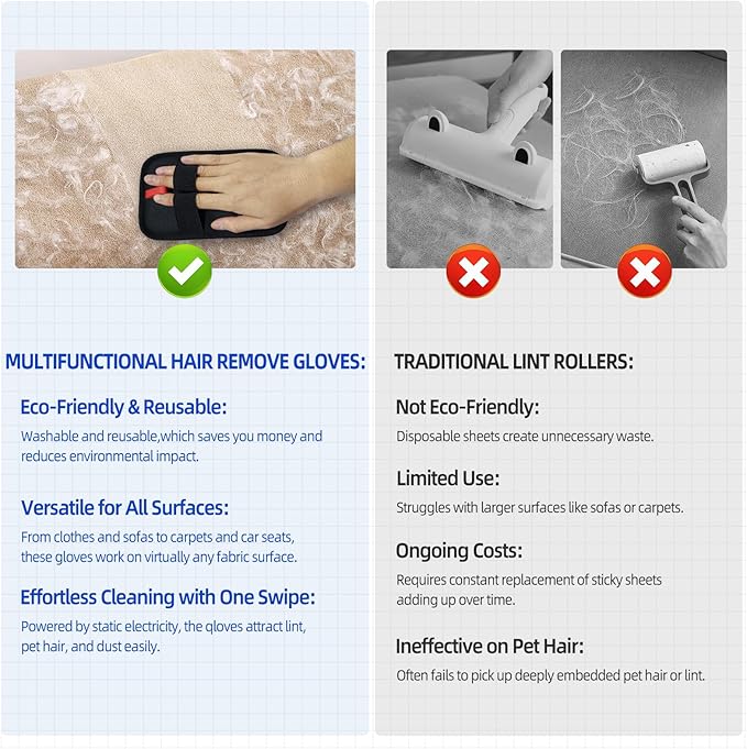 - 【Powerful Electrostatic Hair Removal】Harnessing static electricity technology, these gloves effortlessly attract and trap pet hair, lint, and dust with a simple glide—no more sticky rollers or ineffective brushes! Perfect for clothes, furniture, carpets, and car seats.