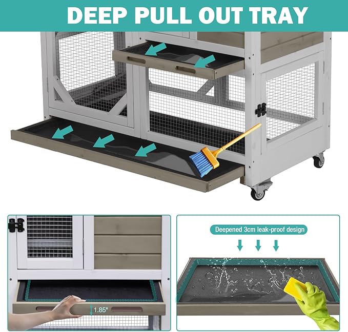 - Effortless Cleaning & Accessibility: Both levels feature slide-out plastic trays for quick waste removal, while the foldable front door, removable roof, and 4 full-access doors let you easily interact with pets, refill food, or clean every corner without hassle