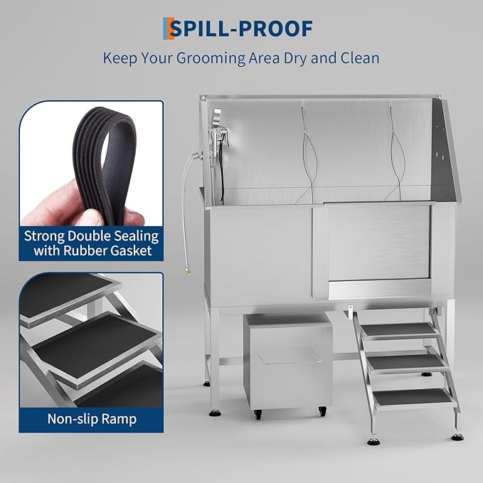 • Efficient Drainage System Removable floor grate prevents water accumulation and simplifies post-bath cleanup. Maintains tidy workspace during grooming sessions.